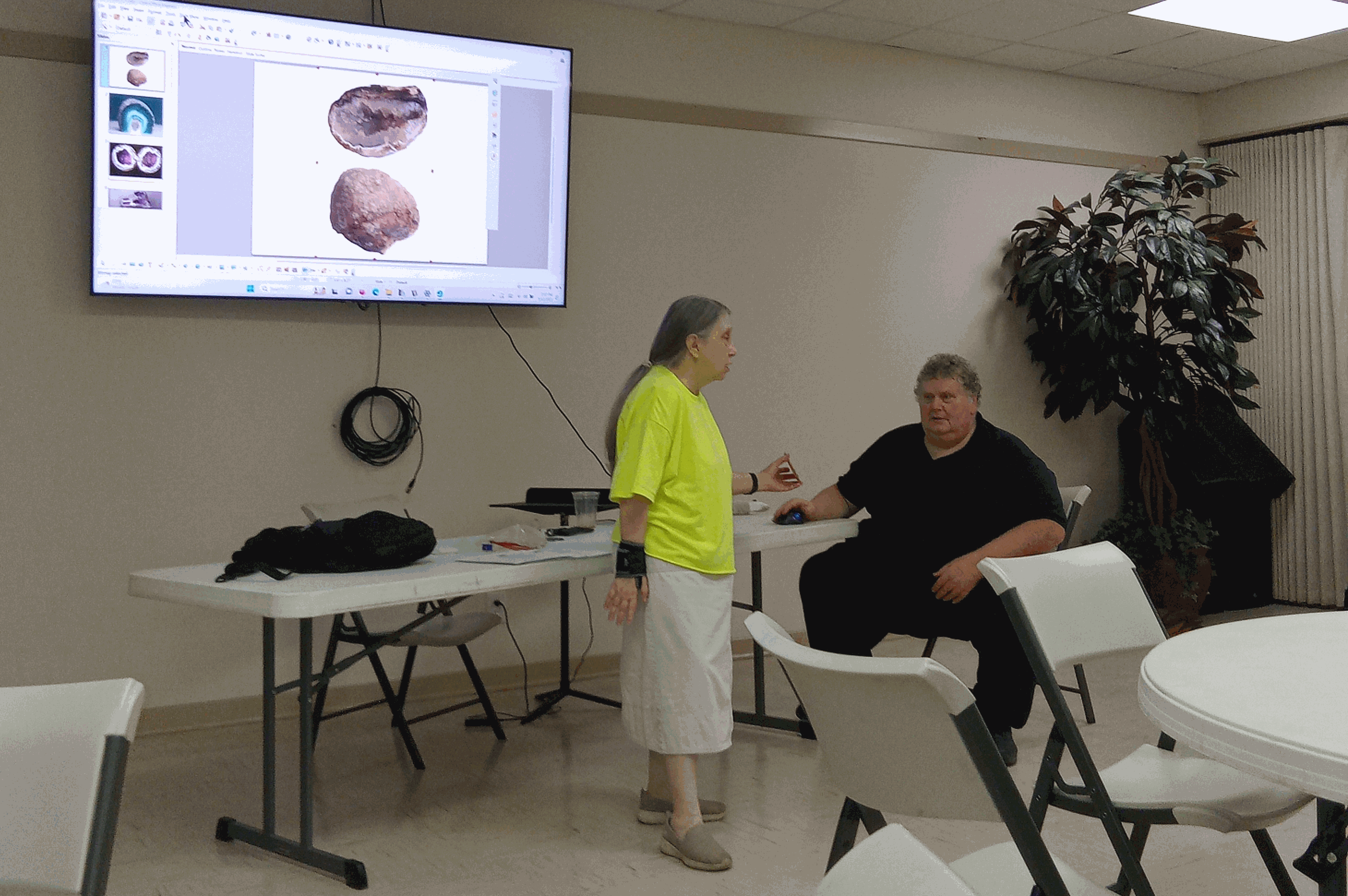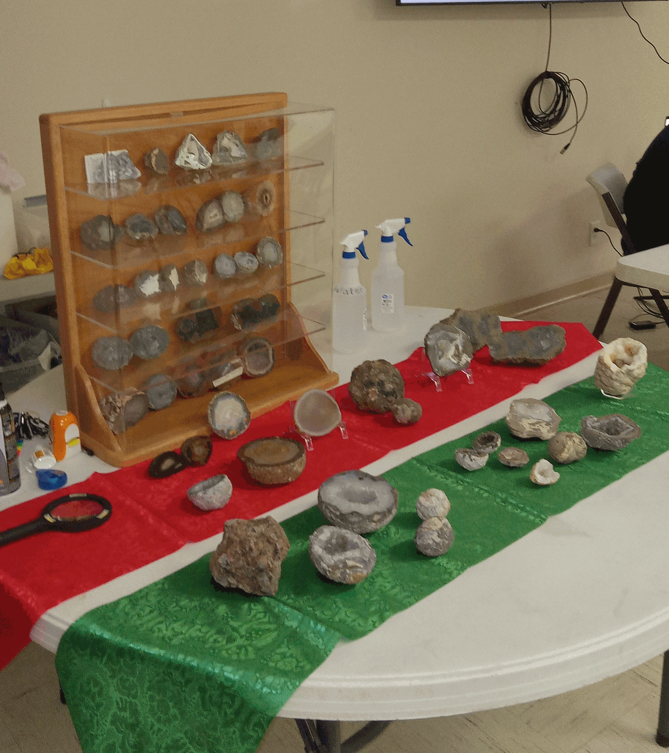 see you are excited about rocks, that's a good thing. Our program was on geodes and how they become a crusty container for an assortment of minerals from delicate crystal shapes to a solid multilayered beautiful mass, perfect for polishing. And it all started with a bubble trapped in cooling lava, filling with mineral laden liquid that turns to a gel that grows the geode innards that stays a hidden surprise until you crack it open. Thanks Levan for that presentation. I didn't know, and now I do. And thank you Sandra, that was a lot of work bringing and displaying those wonderful specimens. And also Ivey for the geode assortment you brought. I'm sorry if you weren't there to see them. Very impressive.